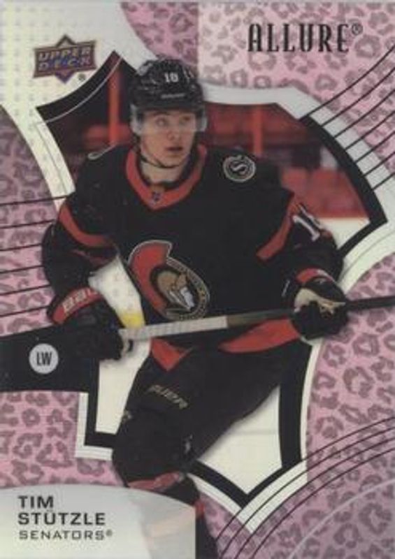 The Tim Stutzle 2021 Upper Deck Allure #80 Pink Blue Leopard card is 1 of 39 Tim Stutzle's card variations in the 2021 Upper Deck Allure set being tracked by Sports Card Investor, including Base, Black Rainbow, Blue China, Orange Slice die-cut, and Red Rainbow.