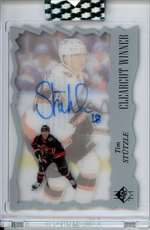 The Tim Stutzle 2022 Upper Deck Clear Cut #CW-TS 2021 Clear Cut Winners card is 1 of 13 Tim Stutzle's card variations in the 2022 Upper Deck Clear Cut set being tracked by Sports Card Investor, including 2021 Base Set, 2021 Black & Amber, 2021 Champs, 2021 Tribute Autos Rookies, and 2022 Tribute Autos Rookies.