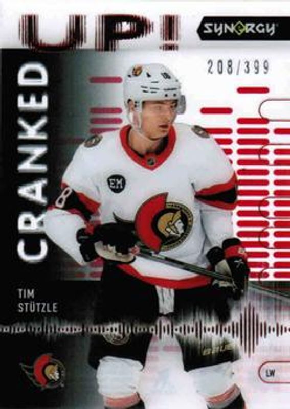 The Tim Stutzle 2022 Upper Deck Synergy #CU-ST Cranked Up - Red /399 card is 1 of 23 Tim Stutzle's card variations in the 2022 Upper Deck Synergy set being tracked by Sports Card Investor, including 2030, Greater Than Signatures, Rink Ink, Rink Ink Mystery Gold Achievements, and Light Up the Night /899.