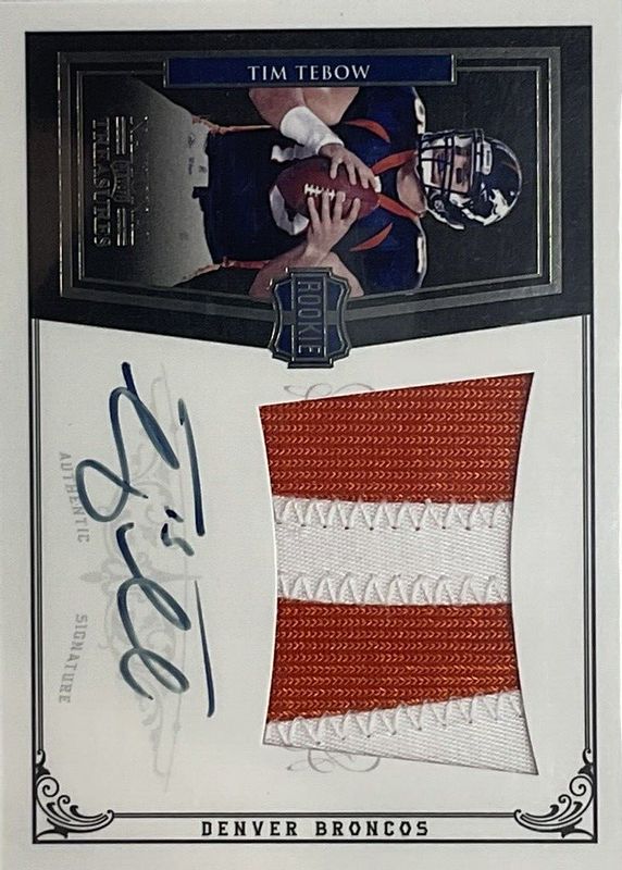 This card is 1 of 3 Tim Tebow's card variations in the 2010 National Treasures set being tracked by Sports Card Investor, including Rookie Patch Auto - Gold /25, and Rookie Patch Auto - Platinum /5.