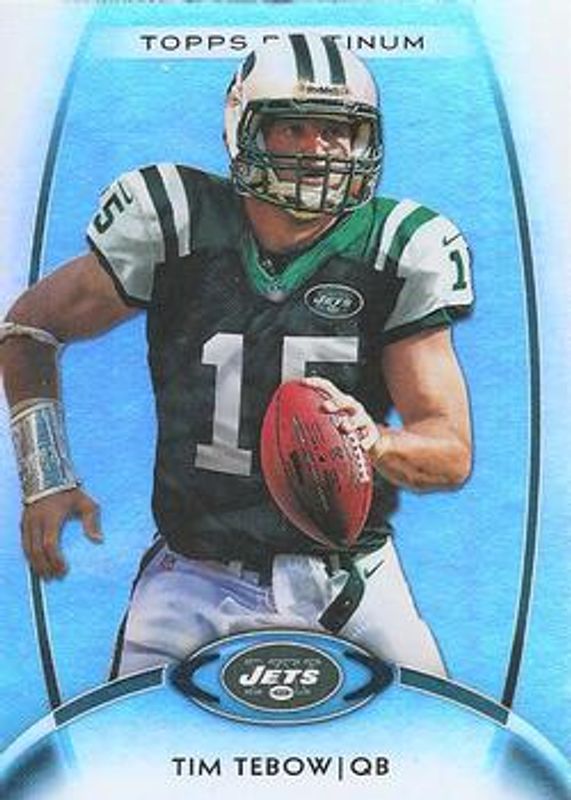 The Tim Tebow 2012 Topps Platinum #15 Base card is 1 of 3 Tim Tebow's card variations in the 2012 Topps Platinum set being tracked by Sports Card Investor, including Ruby, and Autographed Patch - Refractor /5.