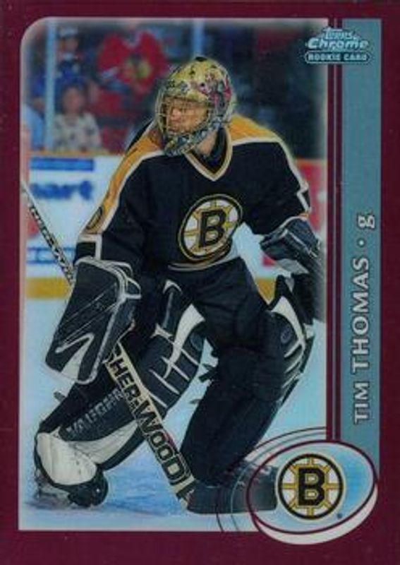 The Tim Thomas 2002 Topps Chrome #162 Refractor Rookie card is 1 of 3 Tim Thomas' card variations in the 2002 Topps Chrome set being tracked by Sports Card Investor, including Base, and Black Border Refractor /100.