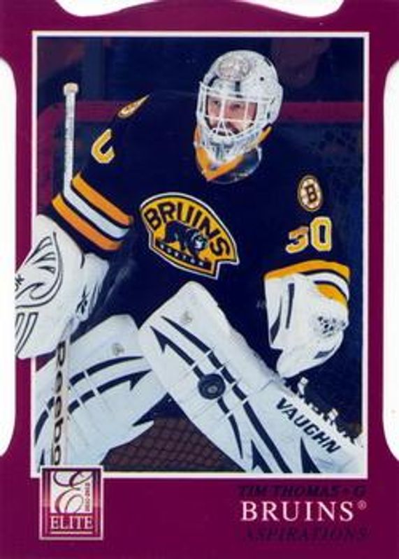 The Tim Thomas 2011 Elite #59 Aspirations /99 card is 1 of 7 Tim Thomas' card variations in the 2011 Elite set being tracked by Sports Card Investor, including Base /999, Gold Status die-cut /10, Stars, Prime Number Jerseys /625, and Prime Number Patches Autos /625.