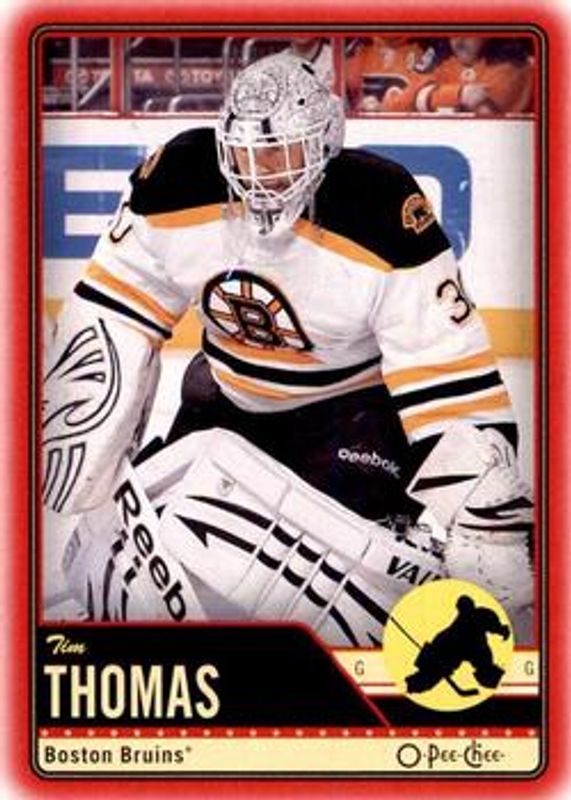 The Tim Thomas 2012 O-Pee-Chee #186 Wrapper Redemption Red card is 1 of 10 Tim Thomas' card variations in the 2012 O-Pee-Chee set being tracked by Sports Card Investor, including Base, Rainbow, Retro, Retro Blank Back, and Black Rainbow /100.