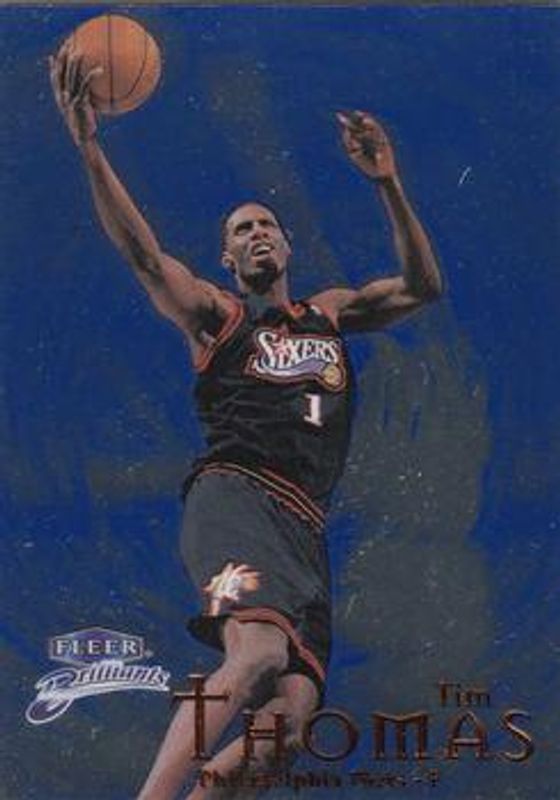 The Tim Thomas (NBA) 1998 Fleer Brilliants #58B Blue card is 1 of 6 Tim Thomas (NBA)'s card variations in the 1998 Fleer Brilliants set being tracked by Sports Card Investor, including Base, Gold /99, Shining Stars, Shining Stars - Pulsars, and 24-Karat Gold /24.