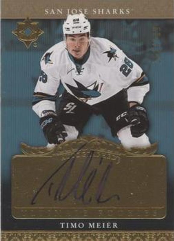 Timo Meier's Hockey cards are available in at least 89 sets. Timo Meier's biggest 7-day price movers are 2016 Upper Deck Ultimate Collection #RRA-ME 2006 Retro Ultimate Rookies Autographs /199, 2016 Upper Deck Ultimate Collection #77 Onyx /10, and 2016 Upper Deck Ultimate Collection #RRJ-ME 2006 Retro Ultimate Rookies Jerseys /99.