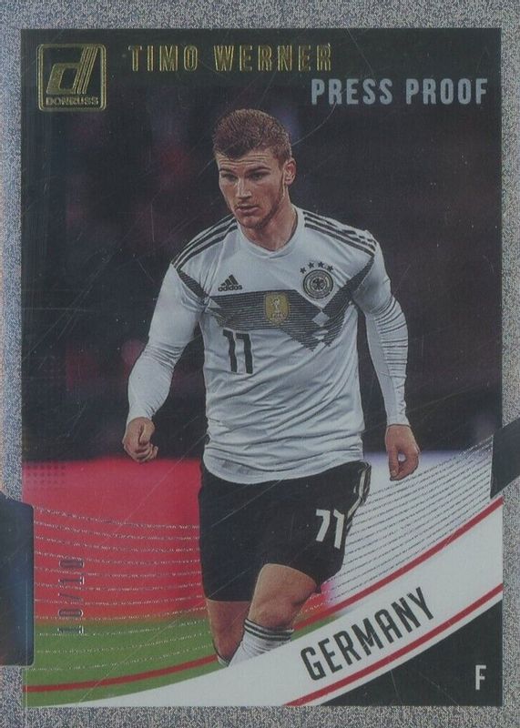 This card is 1 of 21 Timo Werner's card variations in the 2018 Donruss set being tracked by Sports Card Investor, including Base, Press Proof Green, Press Proof Red, Press Proof Silver, and Press Proof Die-Cut /100.