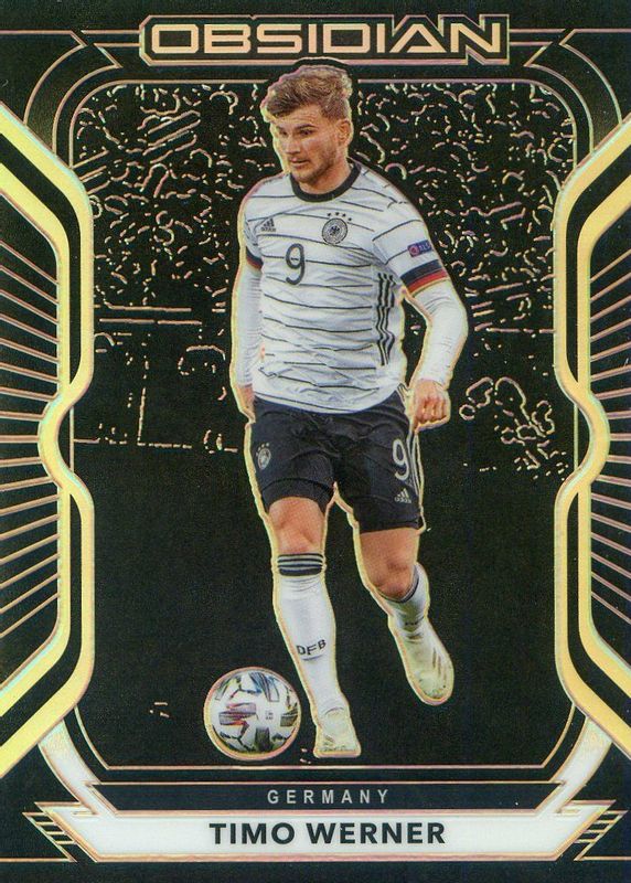 This card is 1 of 23 Timo Werner's card variations in the 2020 Obsidian set being tracked by Sports Card Investor, including Electric Etch Purple /75, Electric Etch Orange /50, Electric Etch Blue /30, Electric Etch Red Flood /28, and Electric Etch Red Pulsar /28.