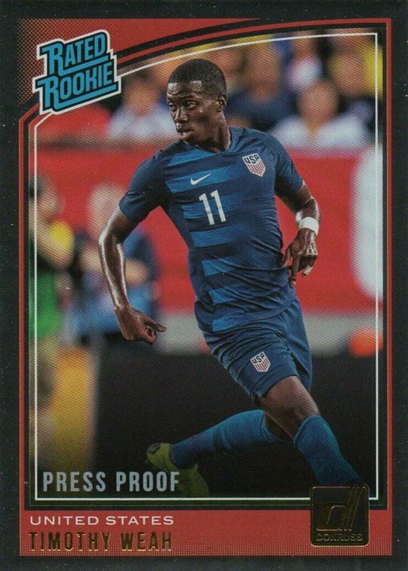 This card is 1 of 21 Timothy Weah's card variations in the 2018 Donruss set being tracked by Sports Card Investor, including Base, Press Proof Green, Press Proof Red, Press Proof Die-Cut /100, and Press Proof Gold /75.