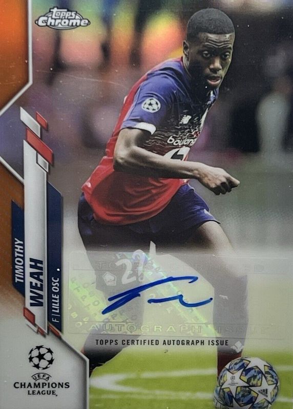 The Timothy Weah 2019 Topps Chrome UEFA Champions League #CA-TWE Autographs - Orange Refractor /25 card in Raw condition has not changed in price in the last 30 days and was last sold for $15.50 .
