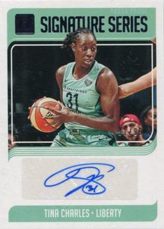 The Tina Charles 2019 Donruss WNBA #SS-TCH Signatures Series - Press Proof Purple /99 card is 1 of 24 Tina Charles' card variations in the 2019 Donruss WNBA set being tracked by Sports Card Investor, including Base, Optic, Optic Holo, Silver Press Proof /199, and Purple Press Proof /99.