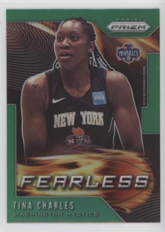 The Tina Charles 2020 Prizm WNBA #15 Fearless - Green card is 1 of 60 Tina Charles' card variations in the 2020 Prizm WNBA set being tracked by Sports Card Investor, including Base, Green, Green Ice, Hyper, and Ice.