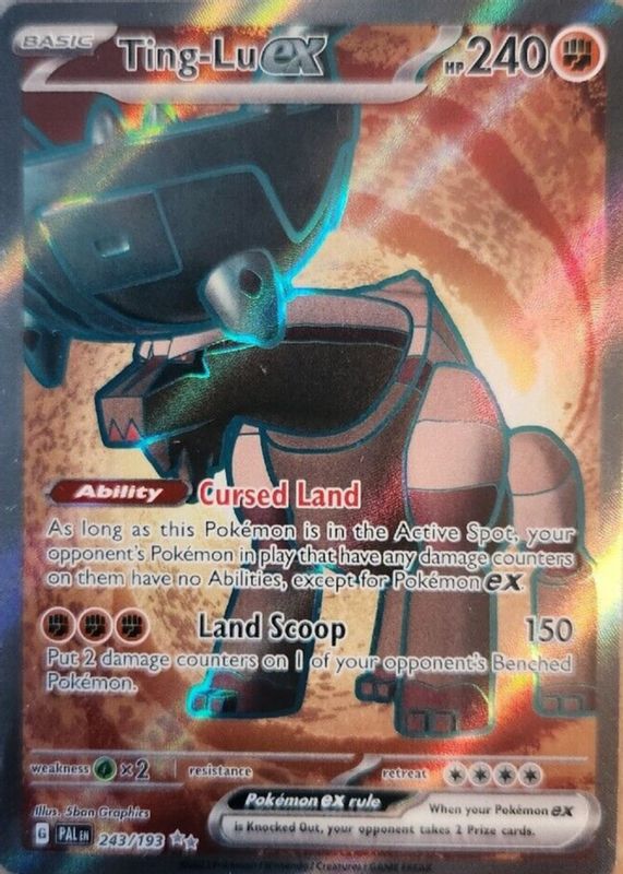 The Ting-Lu ex 2023 Scarlet & Violet: Paldea Evolved #243/193 Ultra Rare (Full Art) card in Raw TCG (Near Mint) condition has moved down -$0.09 (-5.7%) in the last 30 days and was last sold for $1.50 .