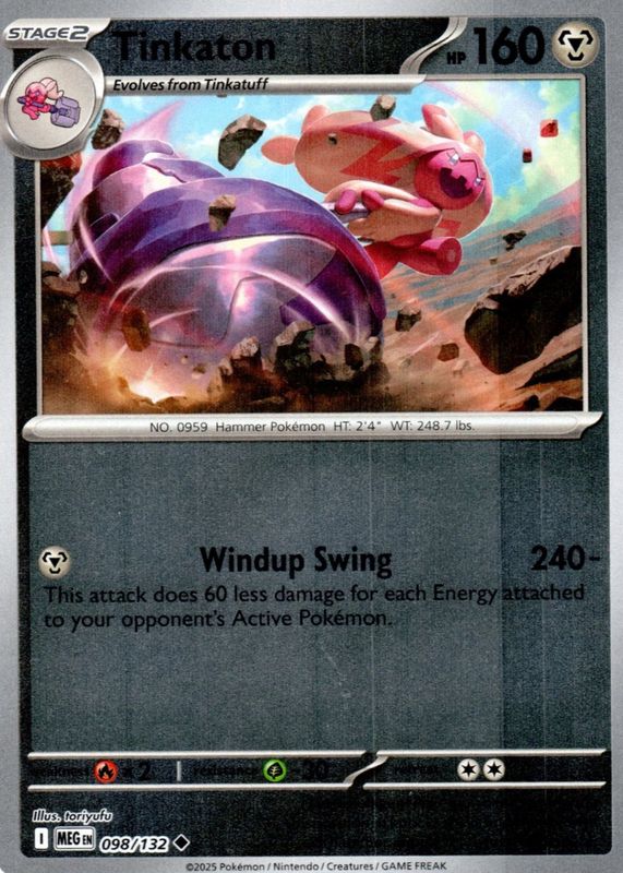 The Tinkaton 2025 Mega Evolution #098/132 Reverse Holo card in Raw TCG (Near Mint) condition has moved up $0.76 (+76.8%) in the last 30 days and was last sold for $1.75 .