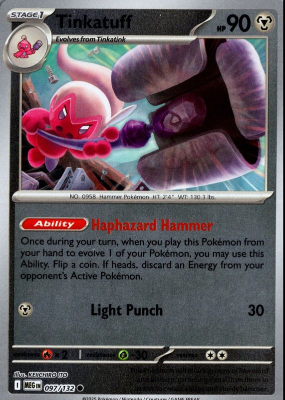 The Tinkatuff 2025 Mega Evolution #097/132 Reverse Holo card in Raw TCG (Near Mint) condition has moved down -$0.08 (-5.7%) in the last 30 days and was last sold for $1.32 .