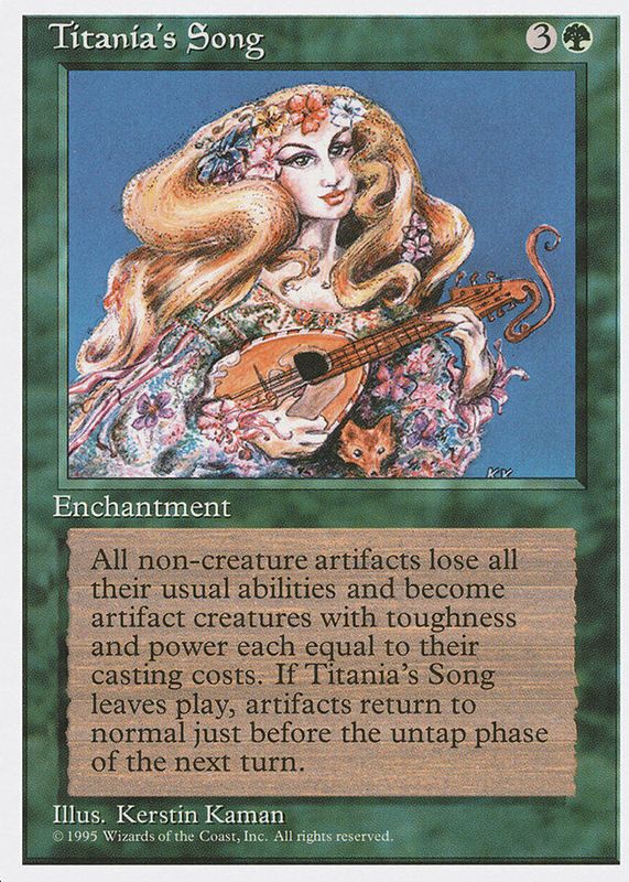 The Titania's Song 1995 Fourth Edition Base card in Raw TCG (Near Mint) condition has not changed in price in the last 30 days and was last sold for $3.29 .