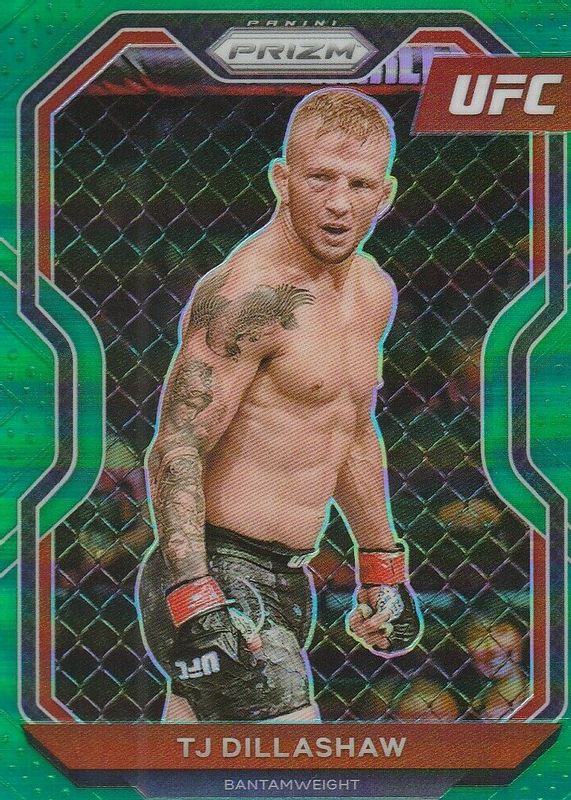 The TJ Dillashaw 2021 Prizm UFC #23 Green card in Raw condition has not changed in price in the last 30 days and was last sold for $5.99 .