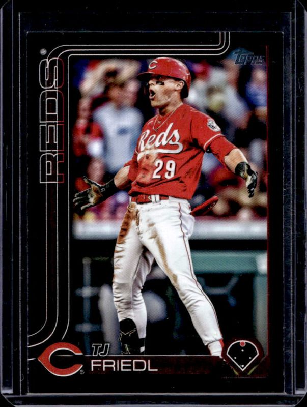 The TJ Friedl 2025 Topps #525 Black /74 card is 1 of 56 TJ Friedl's card variations in the 2025 Topps set being tracked by Sports Card Investor, including Base, Aqua Holo Foil, Diamante Foil, Holo Foil, and Pink Diamante Foil.