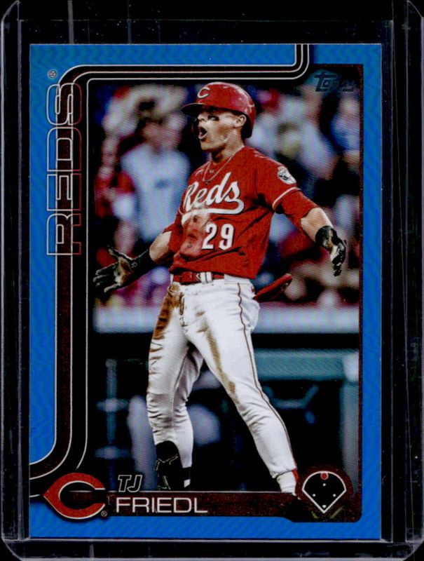 The TJ Friedl 2025 Topps #525 Blue Rainbow /150 card is 1 of 56 TJ Friedl's card variations in the 2025 Topps set being tracked by Sports Card Investor, including Base, Aqua Holo Foil, Diamante Foil, Holo Foil, and Pink Diamante Foil.