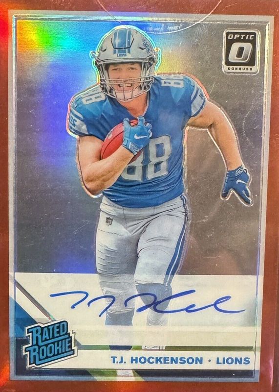 The TJ Hockenson 2019 Optic #171 Rated Rookie Autographs - Red (/15) card in Raw condition has not changed in price in the last 30 days and was last sold for $40.00 .