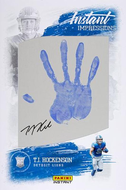 The TJ Hockenson 2019 Panini Instant #NNO Instant Impressions /5 Rookie card is 1 of 21 TJ Hockenson's card variations in the 2019 Panini Instant set being tracked by Sports Card Investor, including Base, Green /10, Black /1, Draft Night, and Rated Rookie Retro /280.