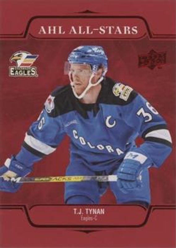 The TJ Tynan 2021 Upper Deck AHL #AS-30 AHL All Stars - Red card is 1 of 3 TJ Tynan's card variations in the 2021 Upper Deck AHL set being tracked by Sports Card Investor, including AHL All Stars, and AHL All Stars - Gold /25.