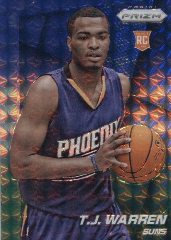 This card is 1 of 37 TJ Warren's card variations in the 2014 Prizm set being tracked by Sports Card Investor, including Base, Blue Mojo, Blue Wave, Green, and Photo Variation.