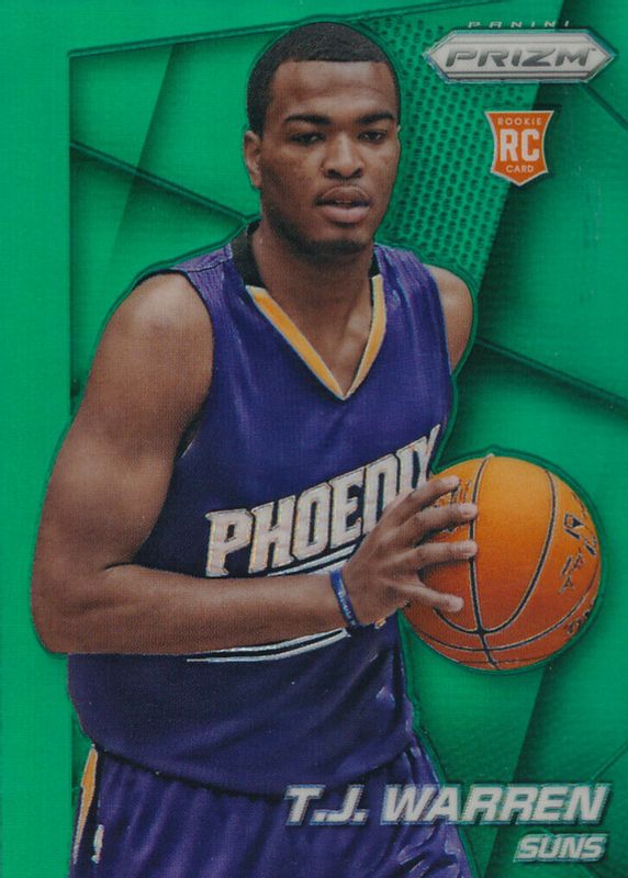 This card is 1 of 37 TJ Warren's card variations in the 2014 Prizm set being tracked by Sports Card Investor, including Base, Blue Green Mosaic, Blue Mojo, Blue Wave, and Photo Variation.