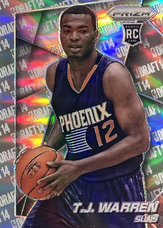 This card is 1 of 37 TJ Warren's card variations in the 2014 Prizm set being tracked by Sports Card Investor, including Base, Blue Green Mosaic, Blue Mojo, Blue Wave, and Green.