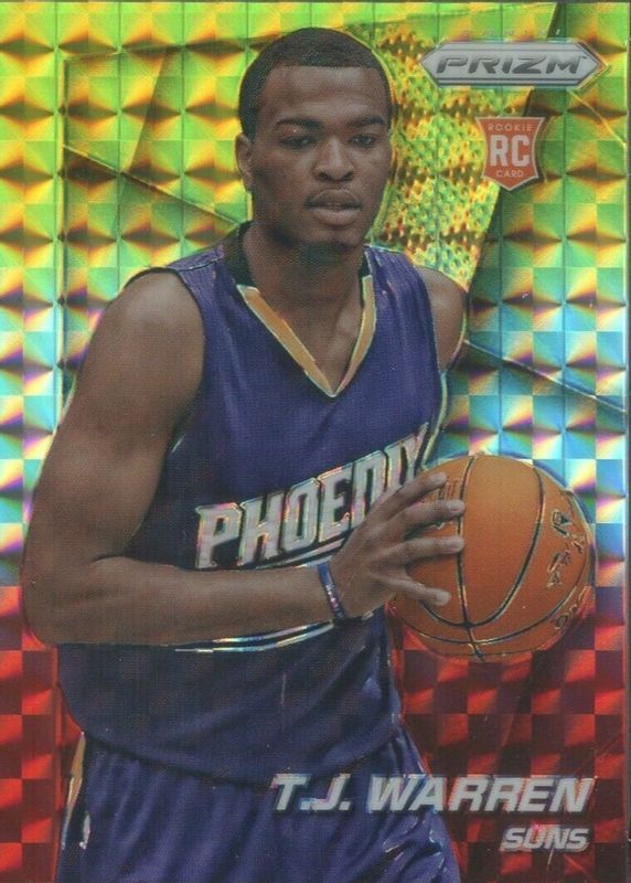This card is 1 of 23 TJ Warren's card variations in the 2014 Prizm set being tracked by Sports Card Investor, including Base, Blue Green Mosaic, Blue Mojo, Blue Wave, and Green.