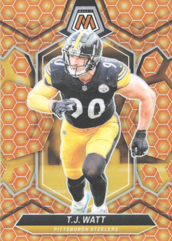 TJ Watt's Football cards are available in at least 127 sets. TJ Watt's biggest 7-day price movers are 2017 Optic #122 Base, 2024 Mosaic #188 Honeycomb /(SSP), and 2024 Mosaic #266 National Pride - Genesis /(SSP).