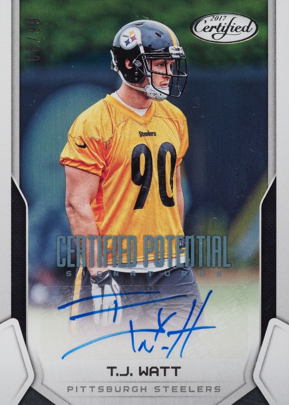 The TJ Watt 2017 Certified #CPS-TJ Certified Potential Signatures (/99) Rookie card in Raw condition has not changed in price in the last 30 days and was last sold for $112.71 .