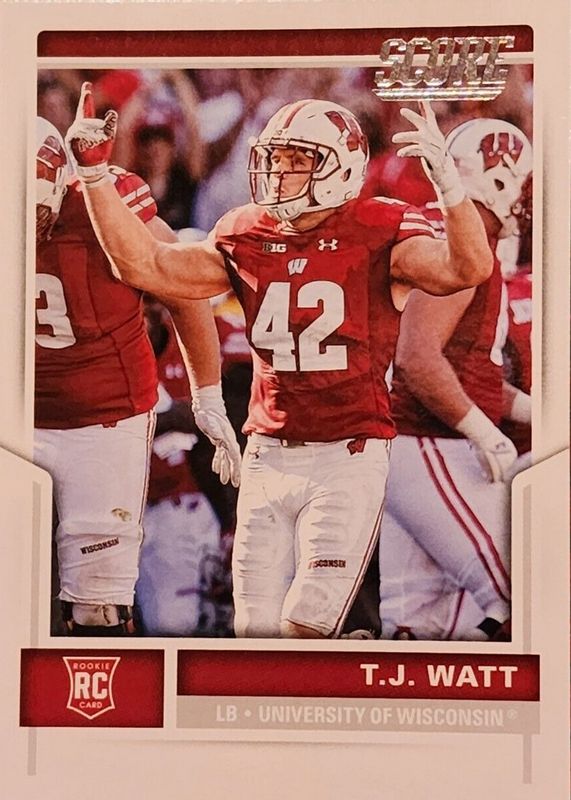 This card is 1 of 24 TJ Watt's card variations in the 2017 Score set being tracked by Sports Card Investor, including Black, Gold, Green, Red, and Scorecard.