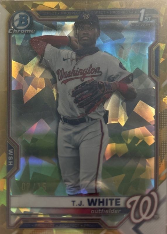 TJ White's Baseball cards are available in at least 3 sets. TJ White's biggest 7-day price movers are 2021 Bowman Draft Sapphire Edition #BDC-157 Chrome - Gold /15 (1st), 2021 Bowman Draft Sapphire Edition #BDC-157 Chrome (1st), and 2021 Bowman Draft Sapphire Edition #BDC-157 Chrome - Red /5 (1st).