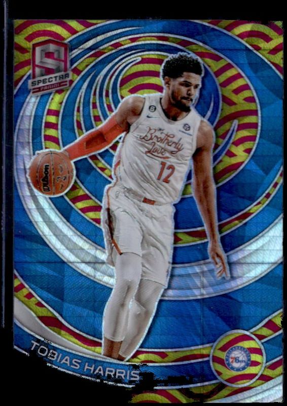 The Tobias Harris 2022 Spectra #112 Asia Red & Yellow /75 card is 1 of 20 Tobias Harris' card variations in the 2022 Spectra set being tracked by Sports Card Investor, including Base, Asia, Asia Black & White, Asia Green, and Asia Red.