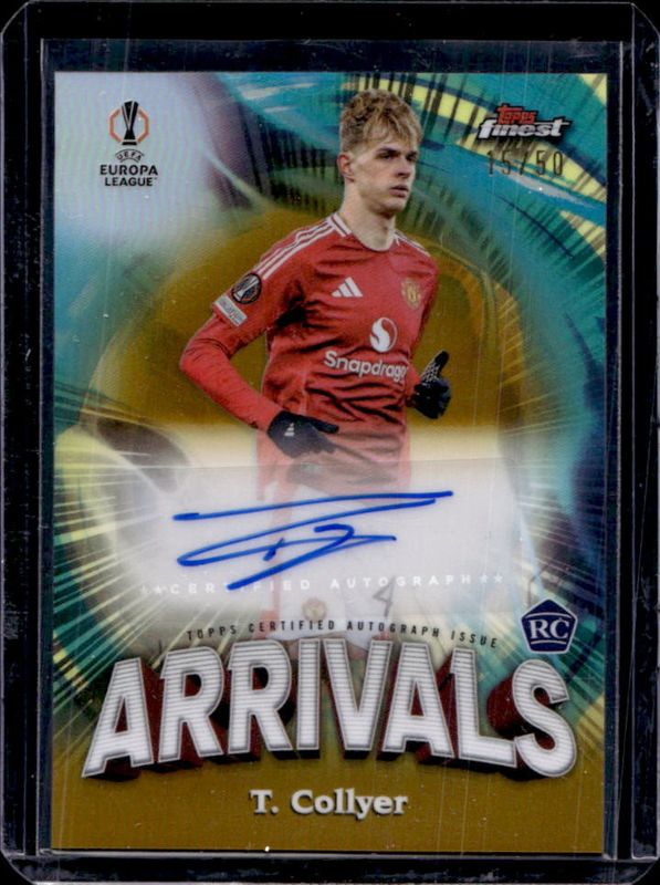 The Toby Collyer 2024 Topps Finest UEFA Club Competitions #AA-TC Arrivals Autographs - Gold Refractor /50 card is 1 of 29 Toby Collyer's card variations in the 2024 Topps Finest UEFA Club Competitions set being tracked by Sports Card Investor, including Arrivals Autographs, Base Autographs, Extended Base RC Variation, Base Autographs - Purple Refractor /299, and Base Autographs - Purple Shimmer Refractor /199.