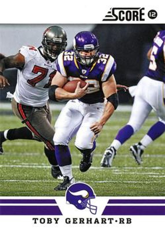 The Toby Gerhart 2012 Score #140 Glossy card is 1 of 11 Toby Gerhart's card variations in the 2012 Score set being tracked by Sports Card Investor, including Base, Gold Zone, Scorecard, Artist's Proof /32, and Red Zone /20.
