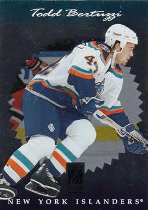 The Todd Bertuzzi 1996 Donruss Elite #18 Base card is 1 of 3 Todd Bertuzzi's card variations in the 1996 Donruss Elite set being tracked by Sports Card Investor, including Die-Cut, and Aspirations /3000.