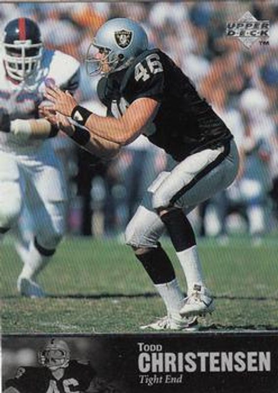 The Todd Christensen 1997 Upper Deck Legends #88 Base card is 1 of 2 Todd Christensen's card variations in the 1997 Upper Deck Legends set being tracked by Sports Card Investor, including Autographs.