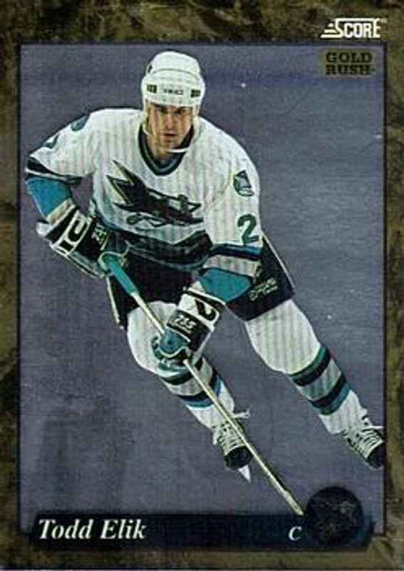 The Todd Elik 1993 Score Canadian #581 Gold Rush card is 1 of 3 Todd Elik's card variations in the 1993 Score Canadian set being tracked by Sports Card Investor, including #185 Base, and #581 Base.