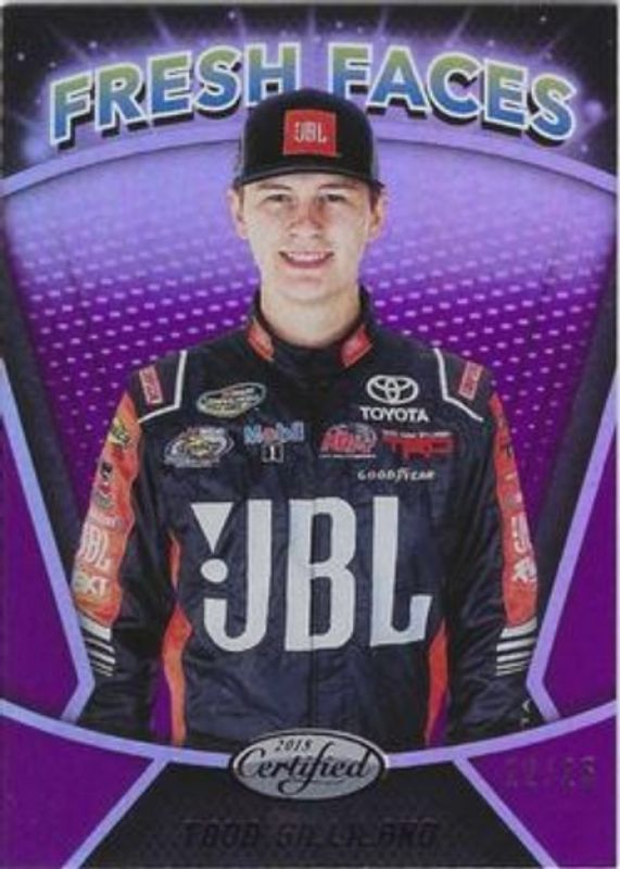 The Todd Gilliland 2018 Certified NASCAR #FF11 Fresh Faces - Purple /25 card is 1 of 18 Todd Gilliland's card variations in the 2018 Certified NASCAR set being tracked by Sports Card Investor, including Certified Next Signatures /210, Fresh Faces /199, Certified Next Signatures - Red /149, Fresh Faces - Red /149, and Fresh Faces - Blue /99.