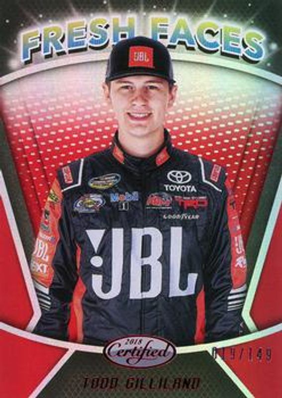 The Todd Gilliland 2018 Certified NASCAR #FF11 Fresh Faces - Red /149 card is 1 of 18 Todd Gilliland's card variations in the 2018 Certified NASCAR set being tracked by Sports Card Investor, including Certified Next Signatures /210, Fresh Faces /199, Certified Next Signatures - Red /149, Fresh Faces - Blue /99, and Certified Next Signatures - Blue /50.