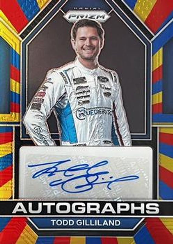 The Todd Gilliland 2023 Prizm NASCAR #A-TGD Autographs - Rainbow /24 card is 1 of 33 Todd Gilliland's card variations in the 2023 Prizm NASCAR set being tracked by Sports Card Investor, including Base, Hyper Blue & Carolina Blue, Hyper Purple & Yellow, Reactive Orange, and Red.