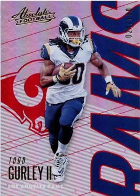 The Todd Gurley II 2018 Absolute #53 Red Spectrum /100 card is 1 of 18 Todd Gurley II's card variations in the 2018 Absolute set being tracked by Sports Card Investor, including Base, Blue Spectrum, Gold Spectrum, Orange Spectrum /65, and Green Spectrum /25.