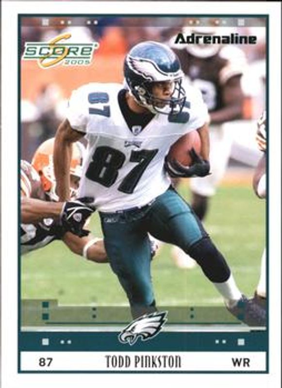 The Todd Pinkston 2005 Score #222 Adrenaline /399 card is 1 of 6 Todd Pinkston's card variations in the 2005 Score set being tracked by Sports Card Investor, including Base, Glossy, Scorecard /599, Revolution /199, and Final Score /17.