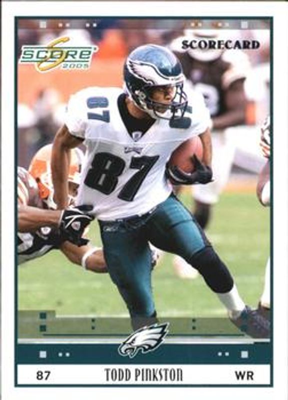 The Todd Pinkston 2005 Score #222 Scorecard /599 card is 1 of 6 Todd Pinkston's card variations in the 2005 Score set being tracked by Sports Card Investor, including Base, Glossy, Adrenaline /399, Revolution /199, and Final Score /17.
