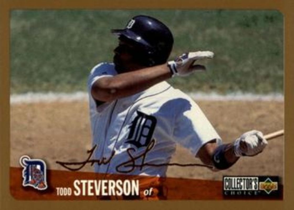 The Todd Steverson 1996 Upper Deck Collector's Choice #546 Gold Signatures card is 1 of 3 Todd Steverson's card variations in the 1996 Upper Deck Collector's Choice set being tracked by Sports Card Investor, including Base, and Silver Signatures.