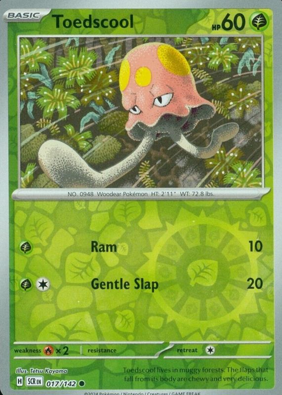 The Toedscool 2024 Scarlet & Violet: Stellar Crown #017/142 Reverse Holo card in Raw TCG (Lightly Played) condition has not changed in price in the last 30 days and was last sold for $0.99 .