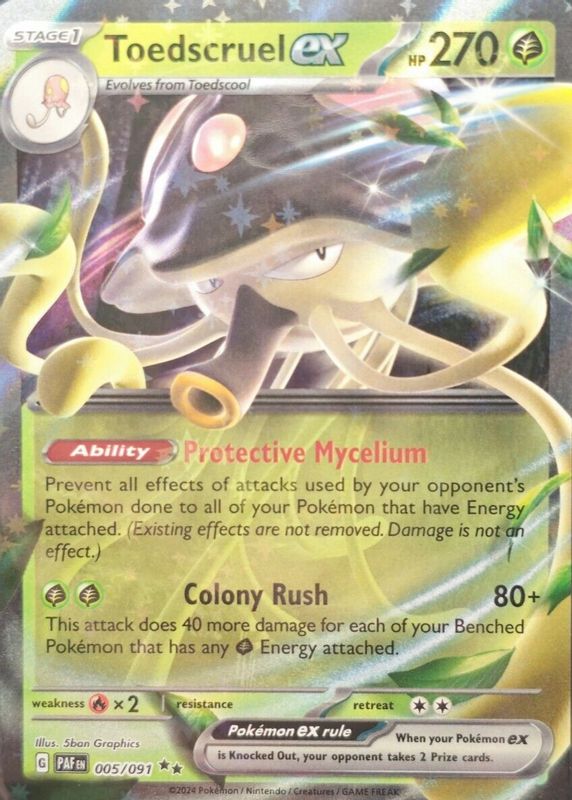 The Toedscruel ex 2024 Scarlet & Violet: Paldean Fates #005/091 Double Rare card in Raw TCG (Near Mint) condition has moved up $0.25 (+14.3%) in the last 30 days and was last sold for $2.00 .