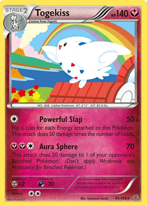 The Togekiss 2015 XY: Roaring Skies #045/108 Base card in Raw TCG (Lightly Played) condition has moved down -$0.43 (-15.0%) in the last 30 days and was last sold for $2.44 .